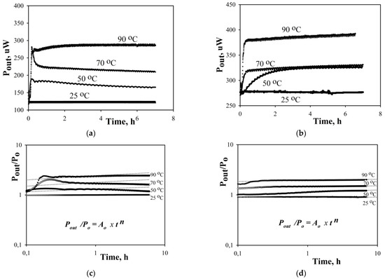 These curves show the change in the position of the operating point on the transfer function of the modulators (Figure 5a,b) with a change in temperature (drift). The operating point moved to a new equilibrium position (tends toward it). The profiles of the experimental curves (Figure 5a,b) are in good agreement with Nagata results [20,21]. Long-term drift consists in a constant slow change Pout around a new equilibrium position. It is important to note that these are exactly slow processes, because the system tends to equilibrium, but the movement of charged defects around the APE-waveguides results in a drift. Thus, for example, in Figure 5b at 50 and 70 °C, Pout almost converges, i.e., the equilibrium points turned out to be close to each other, but at the same time, the activation of the process occurs in different ways.