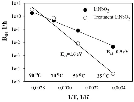 In order to determine Ea, first we normalized test data according to Equation (3) and then adjusted curves with the simplest (linear) equation relative to the obtained results (Figure 5) to calculate coefficients A0 and n. Using Equations (3) and (4), we calculated the speed constant B0. In order to build the Arrhenius function (Figure 6), we used coefficient data (Table 2) at temperatures of 25–90 °C. From a slope of the plots, Ea was obtained. The activation energies of DC-drift for test samples after treatment and reference samples were 1.6 and 0.9 eV, respectively. The obtained values are not the direct activation energy of the material, but they relate to the entire test system according to Equation (3). However, what is more important for us is the comparative analysis of DC-drift in EO-modulators after treatment with LiNbO3 structure obtained at identical process conditions and Ea calculations. The activation energy for treatment LiNbO3 is about two times higher. In order to switch the entire system to an unstable state, one should use two times more energy. In other words, system stability increases after treatment of LiNbO3 structure and DC-drift decreases.