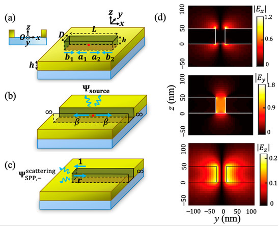 To obtain rigorous data of spontaneous emission enhancement, a full-wave aperiodic-Fourier modal method (a-FMM) was adopted [47,48]. Then, to analyze the physical mechanism of spontaneous emission enhancement of the antenna, a semi-analytical SPP model was established based on an intuitive excitation and multiple scattering process of SPPs. In this model, the rectangular-aperture nanoantenna was treated as a waveguide along the x direction. Since the size of the cross section of the nanoaperture is much smaller than the wavelength, only the fundamental SPP mode is propagative (with an almost real propagation constant) and bounded (field decaying to null in the transversal y and z directions) and thus is considered in the model, while all other higher-order waveguide modes are either evanescent or unbounded [49] and are neglected in the model. The field distribution of the fundamental SPP mode on the y–z cross section was calculated by the full-wave a-FMM [Figure 1d], indicating that the dominant electric-field component Ey was concentrated within the rectangular aperture.