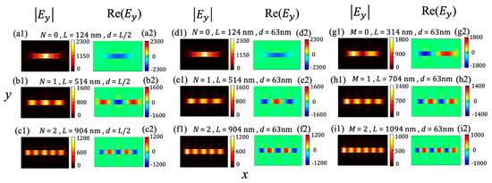 Figure 4 shows the distributions of the dominant electric-field component Ey in the aperture excited by the point source at the resonance peak positions in Figure 2a,b, which are obtained with the full-wave a-FMM [47,48]. It is seen that for the even-order resonances (N = 0, 1, 2), the field Ey exhibits a symmetric distribution about the center of the aperture (x = 0), while Ey exhibits an antisymmetric distribution for the odd-order resonances (M = 0, 1, 2). As shown in Figure 4a–c, when the point source is located at the center of the aperture (d = L/2), only the even-order resonant modes are excited. As shown in Figure 4d–i, when the point source deviates from the center of the aperture (d = 63 nm), both the even-order and the odd-order resonant modes will be excited, and the field distributions of the excited even-order resonant modes are very close to those when the point source is located at the center of the aperture. As indicated by the phase-matching conditions (14) and (15), the location of these resonant modes should be independent of the location of the emitter. Figure 4 also shows that an interference of two counterpropagating SPPs in the aperture forms the standing wave. With the increase in resonance orders (at the same time, the antenna length L increases), the number of standing-wave nodes in the aperture increases and the intensity of the field decreases. The latter is consistent with the gradual decrease in the spontaneous emission rate Γtotal as predicted by the model (see Figure 2).