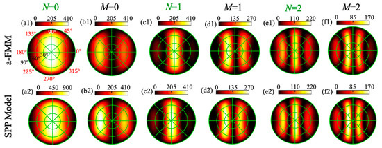 Angular distributions of the far-field emission P(θ,ϕ) of the rectangular-aperture nanoantenna obtained at the antenna resonance (the aperture length L satisfies Equations (14) and (15)) on a hemisphere in z > 0 region (the water side). (a) N = 0, L = 124 nm. (b) M = 0, L = 314 nm. (c) N = 1, L = 514 nm. (d) M = 1, L = 704 nm. (e) N = 2, L = 904 nm. (f) M = 2, L = 1094 nm. The results are obtained at the first six resonance peaks shown in Figure 2b for λ = 1 μm, D = 30 nm and d = 63 nm. The first and second rows are obtained using the full-wave a-FMM and the SPP model, respectively. The polar angle θ and azimuthal angle ϕ correspond to the superimposed green circles and radial lines, respectively.