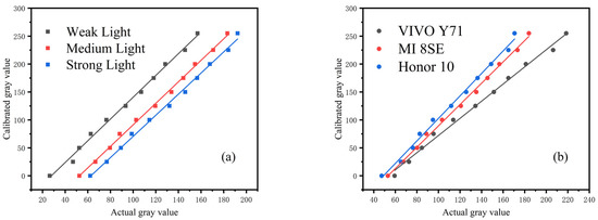 To ensure that the detection results in different environments have a unified reference value, and to ensure the stability and accuracy of the detection results are easy to analyze, the following steps were performed. The calibration curve was established and used to transform the detection value in an arbitrary environment to the calibration value in the standard environment to eliminate the environmental impact. First, the calibration value of the standard black and white card was measured under the standard testing environment. Second, the calibration curve was established using the calibration value of the standard black and white cards. Finally, the calibration value in other environments was obtained through the corresponding calibration curve. Figure 11 shows the calibration curves for different illumination and mobile phones.