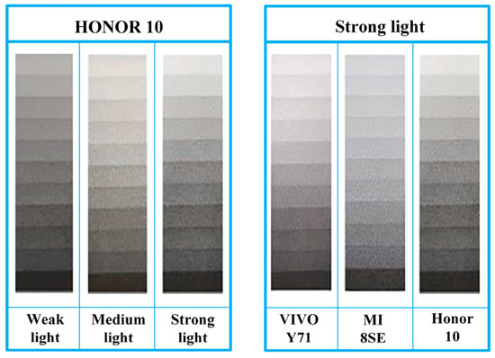 Though under different illuminance and different smartphones, the images are visually different as shown in Figure 10; after measuring the 11 regions on the reference chart, we found that the measured intensities between different ambient conditions have a good linear relationship under different illumination and smartphones. Therefore, to make the measurement convenient and to reduce the number of calculations, two gray cards, namely, standard white and standard black, were selected to replace the standard grayscale card and establish the standard calibration curve.