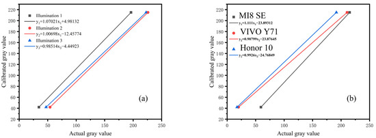 Moreover, the calibration value of the gray card was fitted with the gray value detected by the smartphone. Figure 9a shows the experimental results, and Figure 9b shows gray card images captured in different environments.