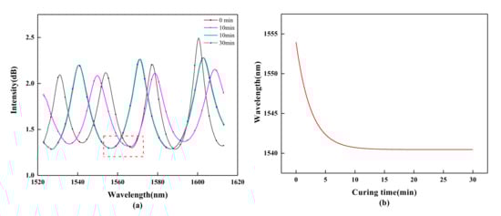 Figure 4 shows the spectrum of reflective light intensity obtained at different curing times. Figure 4a reveals that the reflected range changed the curing time of AB epoxy adhesive. From the red dot-line box, it can be found that the interference spectrum underwent a blue shift. The shift of the spectrum gradually decreased and finally stabilized. When curing time reached 30 min, the interference spectrum became stable. Figure 4b shows the dependence of the peak position of the interference spectrum on the curing time. It can be seen that the range showed an inverse proportional function curve as the curing time increased, and it became stable when the curing time was about 30 min. Thus, the curing time of the AB epoxy adhesive was about 30 min, and the adhesive could meet the requirements of the experiment.