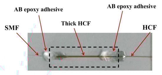 After the AB epoxy adhesive film was cured, the SMF and the HCF with the film were inserted into a section of thick HCF (2 cm long, 363 μm outer diameter, and 150 μm inner diameter) from both sides. The distance between the two SMF and HCF was monitored in real-time by the microscope control platform so that the length of the interference cavity could be precisely controlled, and an interference micro-cavity with a cavity length of 30 μm was obtained. Furthermore, the AB epoxy adhesive was used to fix the two ends of the thick HCF on the SMF and HCF to ensure the stability of the whole structure. The packaged system is shown in Figure 5. The design inside the dotted line in Figure 5 corresponds to Figure 1 schematic diagram of the sensing structure.