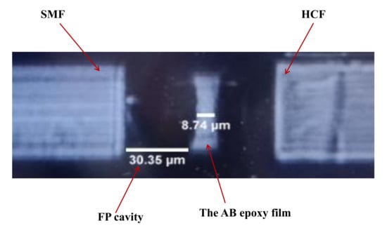 The cavity length and the thickness of the AB epoxy film are difficult to measure directly; however, there is an indirect way to determine their size. The outer diameter of SMF used is 125 μm, and the length of the cavity and the thickness of AB epoxy film can be approximated by scale transformation [31]. Figure 6 is the camera picture of cavity length and AB epoxy film thickness. Taking the outer diameter of SMF as the reference, the cavity length L was measured as 30.35 μm, and the thickness t of the AB epoxy adhesive film was 8.74 μm.