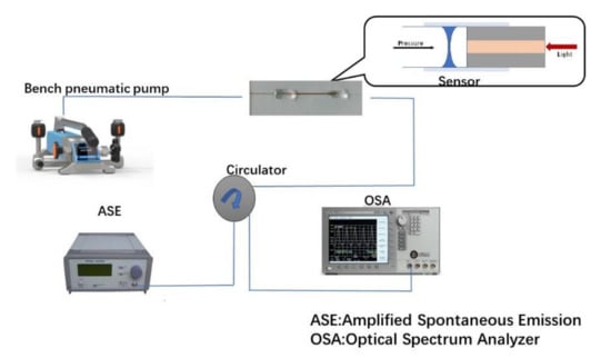 The experimental test schematic diagram is shown in Figure 7. The instruments in the analysis system included a high-precision pressure gauge pump, fiber optic circulator, ASE, and optical spectrum analyzer (OSA). The wavelength range of the ASE light source was from 1530 to 1610 nm. The desktop air pump adopted the Const 162 series of Beijing Const Instrument Technology Co., Ltd. Pressure pumps and high-precision pressure meters provided and calibrated pressure changes. In this way, we could provide a linearly varying pressure value with a resolution of 10 Pa. OSA adopts Yokogawa’s AQ6370D, which could be used to observe and record the spectrum changes in the range of 600 to 1750 nm; the spectrum measurement range was 600–1750 nm. The minimum measurement resolution was 30 pm.