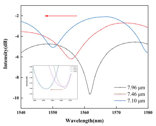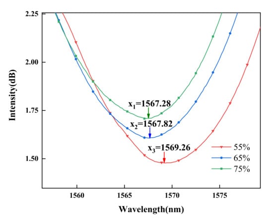 The influence of humidity on the sensor has also been studied. At first, the Testo humidity tester (testo608-H1) was used to detect the environment’s moisture. Second, the interference spectrum of the sensor at different humidity was monitored. Figure 11 shows the movement of the interference spectrum at extra humidity. It can be seen that the interference spectrum showed a blue shift as the humidity increased. When the wavelength was between 1520 nm and 1580 nm, X1, X2, and X3 were the trough of wavelength with different humidity (55%, 65%, 75%), respectively. It was found that the offsets were 0.54 nm and 1.44 nm, respectively. It can be speculated that, in a specific range of humidity changes, humidity has a minor influence on our sensor.