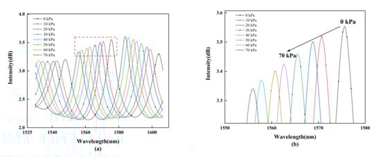 By precisely adjusting the air pressure of the desktop air pump, the spectrum could be monitored and recorded by the spectrometer. Figure 9 shows the interference spectrum measured by the sensor in the range of 0 to 70 kPa. In an experiment, taking the 10 kPa as a step, the scope was calculated after each loaded pressure measurement point was maintained for 30 s to ensure the stability of the measurement data. From Figure 9a, it can be observed that there were three interference peaks in the wavelength range of 1530–1605 nm. Figure 9b shows the local enlargement of one interference spectrum. By selecting the peak position of the interference peak near the 1565 nm wavelength to track the wavelength shift, the relationship curve between the external air pressure and the wavelength shift is obtained. With the increase of air pressure, the peak of the interference spectrum has a blue shift.