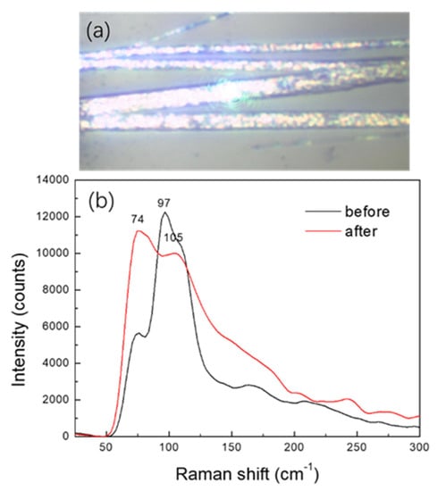 Figure 4a showed the OM image of a laser-induced annealing point on a perovskite MW. The Raman spectra before and after the laser-induced annealing are shown in Figure 4b. For pristine methylammonium lead iodide (MAPbI3) MW, the Raman signals revealed the strongest band at ca. 94 cm−1 and two bands at 74 and 105 cm−1. After the laser-induced annealing process, however, the Raman spectrum was found to change significantly. We observed two distinct main bands at 74 and 105 cm−1, and a considerable reduction of the intensity of the 94 cm−1 band.