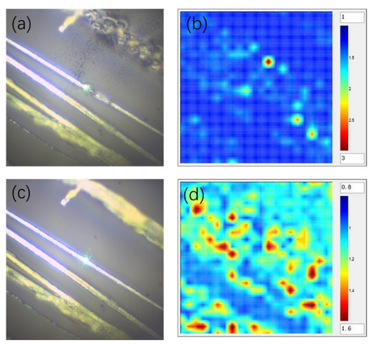 (a) The OM images of perovskite MWs; (b) the Raman mapping of the crystallization improving factor (I105/I97 ratio) before the laser annealing process; (c) the OM images of perovskite MWs; and (d) the Raman mapping of the crystallization improving factor (I105/I97 ratio) after the laser annealing process.