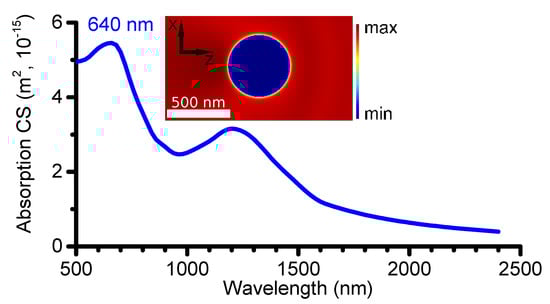 To verify the possibility of the appearance of a QSP resonance in MXene, we also calculated the absorption cross-section of a large spheroidal particle (with semiaxes nm, nm). As expected, a peak at 980 nm was revealed, indicating the appearance of a QSP resonance (see Figure 4) in the spheroidal nanoparticle as well. The symmetry braking of the field distribution with respect to the XY-plane typical for the QSP mode can be observed in the inset of Figure 4. Note that the exhibited sharp rise of the cross-section with wavelengths is due to LSP resonance for , which is typical for sub-micrometer spheroidal nanoparticles.