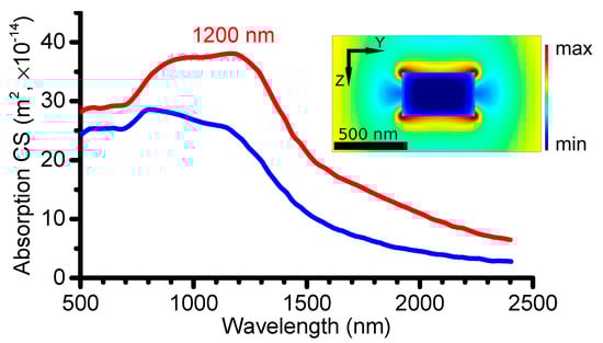 Simulated absorption CS of TiCT cylinder of diameter 500 nm with heights 200 nm (blue) and 300 nm (red). Inset: electric field intensity map of cylinder of diameter 500 nm with height 300 nm at the wavelength of TSP resonance—1200 nm.