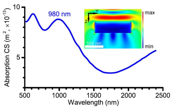 Simulated absorption CS of TiCT cylinder of diameter 1000 nm with height 300 nm. Inset: electric field intensity map at the wavelength of QSP resonance—980 nm.