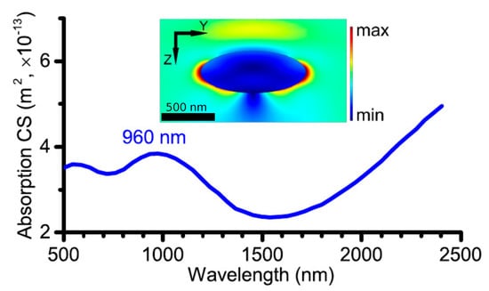 Simulated absorption CS of large spheroidal particle with semiaxes of 500, 200 and 200 nm. Inset: electric field intensity map at quadrupole resonance wavelength, 960 nm.