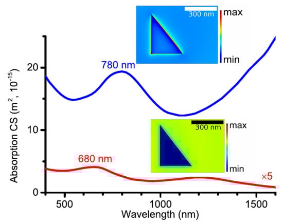Simulated absorption CS of 7.5 nm thick triangular TiCT sheet with side lengths 300, 400 and 500 nm. For the ease of modeling, the triangles are capped at corners by arcs of 2 nm curvature radius. Incident electric field is: perpendicular (TM polarization, red curve) and parallel (TE polarization, blue curve) to the plane of sheet being perpendicular to the hypotenuse. Insets: electric field intensity maps placed above each curve, at the excitation wavelengths of 680 nm for the red one, and 780 nm for the blue.