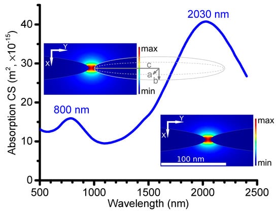 Simulated absorption CS of coupled identical MXene ellipsoids with semiaxes nm, nm and nm. Insets: electric field intensity maps at IBT maxima—800 nm and LSP resonance at 2030 nm.