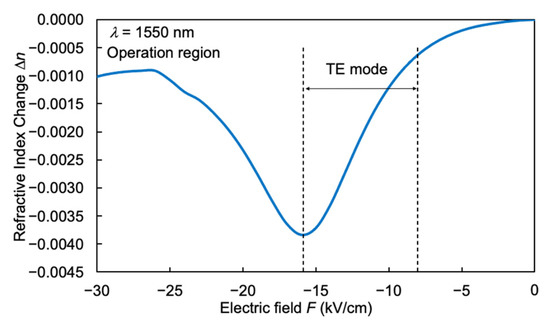 Figure 3 shows the calculated electrorefractive index change in the InGaAs/InAlAs FACQW as a function of the electric field for the transverse electric (TE) mode at the wavelength of 1550 nm. The FACQW shows a large differential refractive index change |Δn/ΔF| of approximately 4.0 × 10−4 cm/kV in the operating range of the reverse electric field F = −8 to −16 kV/cm.