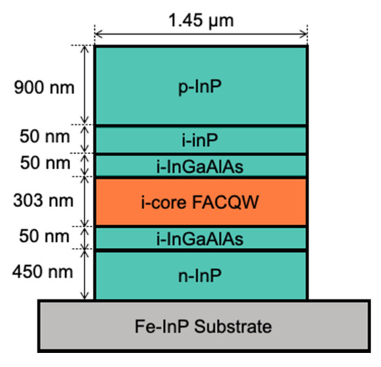 Figure 4 shows a schematic cross-section of the waveguide for the MRR. The waveguide consists of a core layer with 12 sets of InGaAs/InAlAs FACQWs, a 50 nm InAlGaAs separate-confinement heterostructure layer, and p/n-doped InP cladding layers. The doping densities of the upper p-type InP (p-InP) and lower n-type InP (n-InP) cladding layers are assumed to be 1.0 × 1018 cm−3 and 2.0 × 1018 cm−3, respectively. Both sides of the waveguide are buried by benzocyclobutene (BCB), which is a low-refractive-index material. The total thickness of the core layer is approximately 300 nm. The pin diode structure provides a bias electric field of −11.6 kV/cm caused by the built-in potential in the pin junction, which enables the push–pull operation in the operating electric field region of the FACQW. A 50-nm thick undoped InP layer is inserted on top of the core layer to prevent the diffusion of dopants from the p-doped cladding layer and adjust the bias electric field.