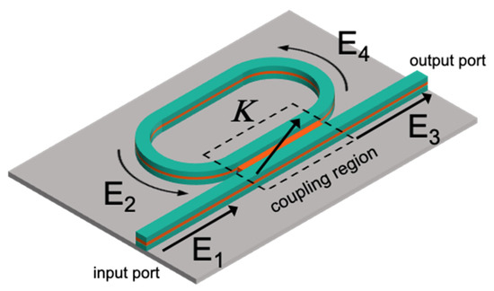 Schematic view of microring resonator with busline waveguide. E1 and E3 are optical electric fields at input and output ports, respectively. E2 and E4 are optical electric fields coming in and going out from coupler, respectively. K is optical power coupling efficiency between microring resonator and busline waveguide.