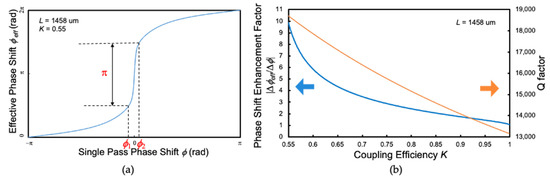 This equation means that the electric field required for driving is reduced by |Δϕeff/Δϕ|−1 by loading an MRR. From Figure 6b, it is necessary to reduce K in order to increase the phase enhancement factor |Δϕeff/Δϕ| and the Q factor. On the other hand, in order to obtain sufficient optical intensity coupled to the microring resonator, K needs to satisfy the over coupling conditions given by