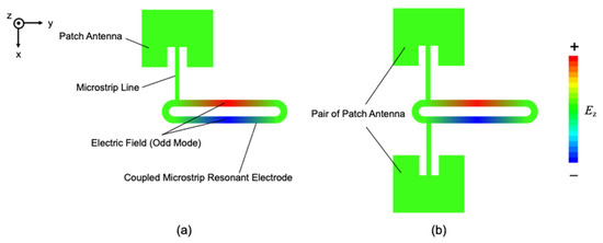 Figure 7 shows the schematic configuration of the ACE used in the proposed modulator. The ACE consists of a patch antenna and a coupled microstrip resonant electrode. The coupled microstrip resonant electrode consists of a coupled microstrip line (MSL) shorted by a ring-shaped MSL. It generates a standing-wave electric field along the coupled microstrip line by receiving power from the MSL [10]. The coupled MSL also assists in the propagation of odd and even modes [24]. In the case of odd mode, when the potential difference between the ground and the coupled microstrip resonant electrode is V, the potential difference between the two lines of the coupled MSL is 2V. Each mode has a different resonant wavelength, so it is possible to excite the odd mode selectively [25]. By symmetrically coupling double antennas to a coupled microstrip resonant electrode (D-ACE), we can obtain higher efficiency of optical modulation than that of a single antenna resonant electrode (S-ACE). The patch antenna and the resonant electrode are modeled separately in the finite element method (FEM) simulation analysis and designed to minimize the reflection at the fed end. The overall loss due to reflection of the electric field is −18 dB in the D-ACE.