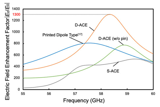 On the other hand, maximum |Ez/E0| is 780 in the structure without the pin junction. This indicates that Ez is enhanced by 1.7 times by using the pin junction. In the case of S-ACE, at the peak frequency, |Ez/E0| of 530 of the incident MMW magnitude E0 can be applied to the core layer. This value indicates that the electric field enhancement in the D-ACE is approximately 2.5 times larger than that in the S-ACE. This is attributed to the fact that the D-ACE has twice the antenna aperture area of the S-ACE, and the MSLs are symmetrically coupled to the coupled microstrip resonant electrode, resulting in less distortion of the standing wave field. The small peak observed at 57.2 GHz in the S-ACE curve is caused by the resonance of the electric field in the MSL between the antenna and the junction of the microstrip antenna (MSA) and the resonant electrode. On the other hand, such a peak is not observed in the D-ACE curve because the impedance of the resonant electrode is changed by the MSL on the other side, and the resonance at 57.2 GHz is suppressed. Compared with the previously reported printed dipole type device with a pin junction [17], the D-ACE is approximately 1.63 times as large as |Ez/E0|.
