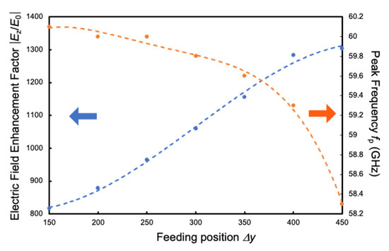Figure 12 shows the relationship between the electric field enhancement factor |Ez/E0| and the distance Δy from the center of the coupled microstrip resonant electrode to the feeding point of the MSL. We can see that |Ez/E0| increases with the increase in Δy, and the peak frequency shifts to the high-frequency side. This is due to the fact that the characteristic impedance is higher when Δy is smaller because the standing wave field induced in the coupled microstrip resonant electrode has its peak near the center. In this modulator, the MSL, MSA, and a coupled microstrip resonant electrode are impedance-matched at 110 Ω, which is much smaller than the characteristic impedance at Δy = 0. Therefore impedance matching is easier for smaller Δy.
