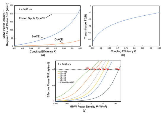 Figure 14 shows the relationship between the coupling efficiency K, phase change f, and transmittance T. The phase change was calculated by substituting the electric field enhancement factor |Ez/E0| at the peak frequency obtained from Figure 11 into Ez in Equation (14). In Figure 14a, we can see that the input power density required for driving, P, decreases with the decrease in the coupling efficiency K. On the other hand, Figure 14b shows that the transmittance T also decreases and the insertion loss increases with the decrease in K. That is, there is a trade-off between the phase enhancement effect and the insertion loss. Considering the insertion loss, K of 0.8 or larger is preferable for practical use. In the case of K = 0.8, the input power required to obtain a phase change of π/2 is 12.