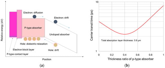 One key consideration to simultaneously achieve a larger responsivity and bandwidth is engineering layer structures to reduce the entire carrier transit time with as thick an absorber as possible. A hybrid absorber is effective for this [6]. Figure 1a shows a schematic of a hybrid absorber. It consists of a p-type InGaAs absorber at the p-type contact side and an undoped InGaAs absorber at the opposite side. Under the operating bias voltage, the electric field is invoked only in the undoped absorber, while the p-type absorber remains electrically neutral. The electrons generated at the p-type absorber act diffusively with an electron diffusion coefficient of De. Note that an electron basically moves in both the direction of the p-type contact and its opposite side due to diffusive motion. The electron block layer helps electrons move toward the undoped absorber side. After the electrons are injected into the depleted (undoped) absorber, they drift together with the electrons generated in the undoped absorber. The drift velocity of electrons is governed by the saturation velocity of the electrons in InGaAs. The holes generated in the undoped absorber also are pushed toward the p-type InGaAs absorber by drift. They then behave as a majority carrier in the p-type InGaAs absorber. The electron drift velocity is one digit larger than that of the holes, and the dielectric relaxation time of the hole in the p-type absorber is negligibly smaller compared with other carrier transit times. Thus, in all carrier flows, we can take only electron diffusion and hole drift times into account for considering carrier transit time. Importantly, the responsivity of the hybrid absorber is determined by its total thickness, including its p-type and undoped absorbers. To summarize, the total carrier transit time in a hybrid absorber can be mitigated while maintaining a certain responsivity and, thus, leads to a larger bandwidth.