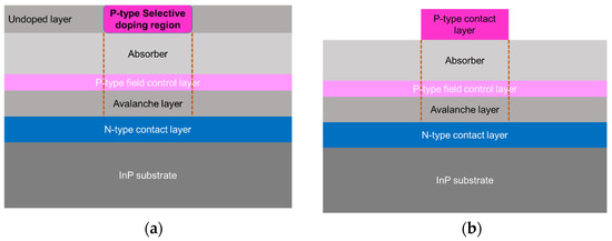 The vertical illumination structure is beneficial for ensuring reliability because it can be applied to various structures to confine the electric field into a device to avoid device failures owing to surface degradation. Previous studies on avalanche photodiodes (APDs), which require a tighter design to make them reliable, have focused on how to confine the electric field into the central region of the device [7,8,9]. The basic idea for a device structure to confine the electric field in the center of the device is to form a selectively doped region at the undoped layer [10,11,12,13]. Figure 2a shows a representative APD structure using selective diffusion techniques. The selectively doped p-type contact region in the top undoped layer defines the active region of the device. Thus, the sidewall of the device has no electric field in principle. A similar concept is achieved by the etching process by Levin et al. [14], as shown in Figure 2b. They used an etched mesa-form p-type contact layer rather than a p-type selective doping region, eliminating uncertainty in the active region caused by selective diffusion or the ion-implantation process. This concept has been extended to other mesa-type APDs [15,16].