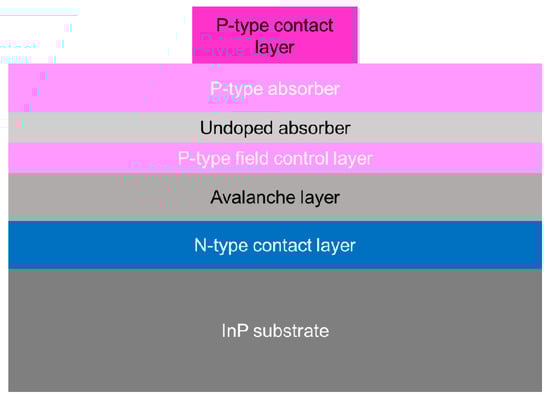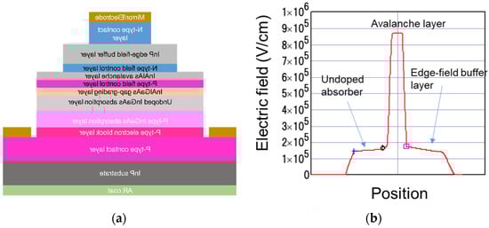 The thickness of the hybrid absorber is 500 nm. Seen from the pin-PDs discussed in the Section 3, the inverted p-down design efficiently decreases the surface leakage current. However, we also have to consider the electric field of the internal region in the case of an APD. A bias voltage as large as 30 V needs to be applied to this APD, and the electric field in each layer reaches several hundred kV/cm, unlike in pin-PDs. During such a situation, the edge field invoked in the edge region of each mesa can be problematic. Particularly, if the edge field reaches the avalanche layer, avalanche multiplication will be enhanced at the local region, leading to an abnormal breakdown. The edge-field buffer layer helps mitigate this. The edge-field buffer layer separates the avalanche layer and n-type contact layer spatially, weakening the edge field by the n-type contact layer at the avalanche layer. The edge-field buffer layer also is exposed to the edge field; however, the n-type field-control layer lowers the electric field in the edge-field buffer layer, as shown in Figure 7b. Figure 7b is the electric field profile of the APD under the gain condition of around 5.