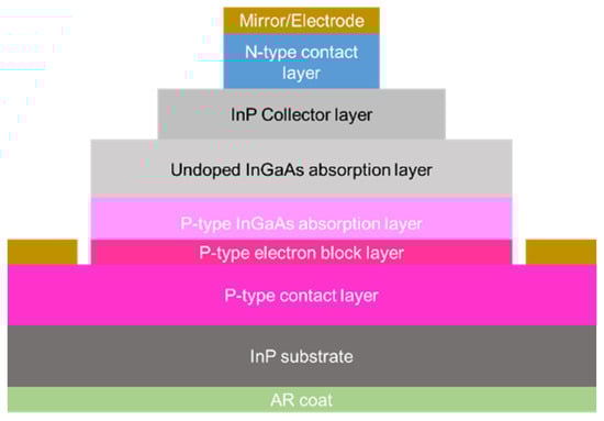 The layer structure includes a p-type contact layer, a p-type electron block layer, a hybrid absorber consisting of p-type and undoped InGaAs absorbers, an InP collector, and an n-type contact layer, which are placed on top of the InP substrate starting from the p-type contact layer. To obtain a vertical and backside illumination structure, the anti-reflection coat is formed on the backside of the substrate. The mirror on the top reflects the signal light from the bottom side; thus, this structure has a two-path configuration. The active region of the device is defined by the area of the mesa-form n-type contact layer. Since the “terrace” region between the InP collector and n-type contact layer is formed in the undoped layer, strong confinement of the electric field can be achieved.