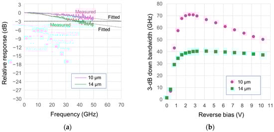 (a) Frequency characteristics of our inverted p-down pin photodiodes (pin-PDs) with 10- and 14-um active diameters, and (b) the bias-voltage dependence of 3-dB down bandwidth for these pin-PDs.