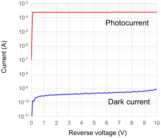 Current-voltage (I-V) characteristics of our inverted p-down pin photodiodes (pin-PD) with a 10-μm active area diameter.