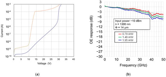 (a) Current-voltage (I-V) characteristics and (b) frequency characteristics of fabricated inverted p-down avalanche photodiodes (APD).