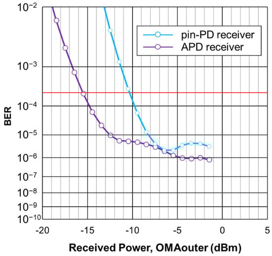 We mounted this APD onto an optical receiver together with a commercially available trans-impedance amplifier and conducted a bit-error-ratio (BER) measurement to confirm the capability of the APD to handle a 100-Gbit/s PAM4 optical signal. We used our in-house semiconductor optical amplifier assisted extended reach electro-absorption modulator integrated with distributed feedback laser (AXEL) with a wavelength of 1294.82 nm and an average launch power of +8.4 dBm as a transmitter [22]. A commercially available digital signal processor was connected to the transmitter and receiver to measure receiver sensitivity at a BER of 2.4 × 10−4, which corresponds to the error-free condition assuming KP-4 forward error corrector (FEC). Figure 9 shows the BER characteristics. A minimum receiver sensitivity of −15.5 dBm in the outer optical modulation amplitude (OMA outer) was achieved at the APD gain of 5 for a 100-Gbit/s PAM4 optical signal. The BER characteristics of the optical receiver with a pin-PD also is shown in this figure. Compared with the receiver sensitivity of the pin-PD receiver of −10.3 dBm, the APD receiver exhibited a 5.2-dB improvement.