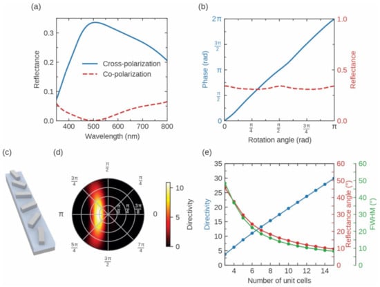 In Figure 3b, the phase response is plotted against the rotation angle at 500 nm for the same structure, confirming a linear 2π phase coverage that was achieved from the rotation of nanobricks. To demonstrate the beam-steering capabilities, a metasurface with a linear phase gradient was designed (see Figure 3c). A supercell consisting of six bricks with different phase responses covering the full 2π range was simulated. The combined length was equal to six times the unit cell used in Figure 3a,b. The angle-dependent far-field response is shown in Figure 3d. Ф is the angle in the x-y plane and represents the angular component, while the z-angle Θ is the radial component forming a hemispherical surface. The far-field response is given in the unitless directivity, which denotes the intensity normalized to a Huygens scatterer with unidirectional scattering. For a phase gradient of 2π over six 200 nm unit cells, the generalized Snell’s law predicts a reflectance angle of 24.6°, which matches well with the maximum in Figure 3d at 24.3°. Furthermore, a main lobe with a directivity of 10.0, combined with no apparent side lobes, provided a very clean signal. Similar simulations were performed with different numbers of unit cells that imprint an overall 2π phase grating. The simulated reflectance angles are shown in red in Figure 3e. The smaller the grating pitch (the number of 200 nm unit cells), the larger the anomalous reflectance angle. However, reducing the number of unit cells increased the phase-step gap in the discretization of a linear grating phase, eventually reducing the directivity maximum (in blue in Figure 3e), and the main lobe broadened with an increased full width at half maximum (FWHM) (in green). Therefore, depending on the application, one must choose between large anomalous reflectance angles with a high phase gradient and high lobes with a smooth phase gradient.