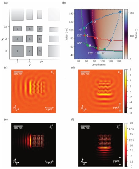 (a) Schematics of a birefringent metasurface that was capable of exciting directional SPPs. The supercell consisted of nine nanobricks in a 450 × 450 nm area with an average pitch of Λ. In (b), the length and width of a Bi2Te3 nanobrick with a unit cell size of 160 nm and a spacer layer of 30 nm was tuned from 30 to 150 nm, where the color code shows the phase response for x-polarized light. At a 55 nm width, a transition from an overdamped to an underdamped system was visible. The isolines at 0°, 120°, and 220° for x-polarization in the underdamped region are marked with solid lines, while the isolines for the y-polarization are marked with dashed lines. The nine intersection points marked with dots each correspond to one of the bricks in (a). Note that unequal phase steps were chosen to create the 2π phase gradient over the supercell length. To maintain a linear gradient, bricks with 220° phase responses were slightly shifted. (c,d) show the z-component of the electric field for x- and y-polarized light, respectively, while (e,f) show the corresponding intensities. (c–f) were normalized to the excitation field and reveal highly directional SPP excitation.