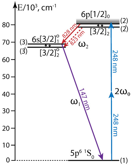 Energy states of atomic Xe involved in our interaction scheme are shown in Figure 4, namely, the ground state (1), KrF laser driven upper states (2) and (2), and intermediate states (3) and (3). Dipole transitions between the Xe ground (1) and excited states (2), (2) are forbidden while two-photon transitions are allowed. Energies of the upper states (2) and (2) relative to Xe ground state 1 are 80,119 cm and 79,212 cm, respectively, [38], which is somewhat less than a doubled energy of KrF laser photons at central wavelength 248.4 nm (40,258 cm). However, two-photon resonance excitation of the state (2) becomes possible owing to effective spectrum broadening in 20 m air pass before the gas cell. The neighbour state (2) still remains out of the broadening interval but is populated in energy exchange collisions due to a small energy difference of 906 cm between (2) and (2) Xe states [41]. This apparently explains 30-fold difference in intensities of 828.00 nm and 823.16 nm lines observed in our experimental conditions (see Figure 3) even though the relevant radiative transitions have comparable probabilities of s and s, respectively [38]. The VUV transition from state (3) to the ground state (1) is allowed, while transition from (3) to the ground state is forbidden. The state (3) is depopulated in collisional exchange with the state (3) and due to formation of Xe dimer molecules [41].