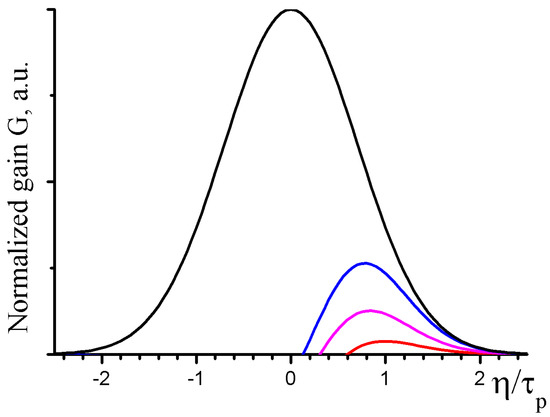 Normalized gain of the four-wave mixing process as a function of eigen time coordinate of the pump KrF laser pulse. The gain curves correspond to the pump pulse areas exceeding the threshold value by 25% (red), 50% (magenta) and 75% (blue), respectively. For comparison, the pump pulse Gaussian envelope is shown by the black line.
