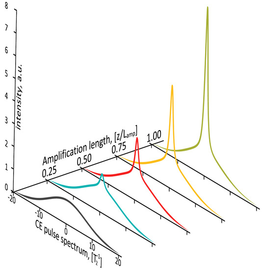 According to Equation (16), spectrum of the IR pulse amplitude exhibits narrowing with the distance travelled in xenon until it reaches limiting value determined by the reciprocal characteristic transverse relaxation time . This process is illustrated in Figure 6. It is assumed that initial spectrum is Gaussian with the width corresponding to the pulse duration of 1 ps, the transverse relaxation time is ps. The pump pulse area is assumed to be constant over the amplification length and equals to the above threshold value, . Note, measuring of the limiting spectrum width of the amplified pulse can be considered as an independent method for experimental determination of the transverse relaxation time for a given transition: so, as a result of our experiment [32], one can conclude that the transverse relaxation time of transition in xenon at 1 atm pressure is determined to be 10 ps.