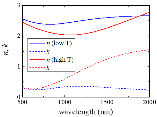 Figure 1 shows the spectral response of the refractive index, n and the extinction coefficient, k of VO by using the paramters in Table 1. As the wavelength increases, k of VO at high temperature increases gradually, however, that at low temperature is slightly changed.