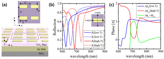 VO has the metal-insulator-transition behavior, and VO based metasurface manipulating the polarization control has widely been demonstrated in the IR and THz region [37,41,46]. However, high-efficient VO based metasurface in the visible range has not been reported yet. In this section, we proposed a simple metasurface with VO thin film with Au nanorod array, which provides a great advantage for the fabrication. Figure 2a shows the schematic view of a reflectarray PB-phase metasurface. An array of Au nanorods is on top of a thin VO film which lies on the Au thick film. The structural parameters of the Au nanorod are defined at Figure 2a. The optimized structural parameters of the Au nanorod (see Figure S1 in Supplementary Materials) are w = 80 nm and L = 200 nm when the period (a) and the thickness (t) is fixed at 300 nm and 30 nm, respectively. Here, the thickness of the VO film is set as 80 nm which is close to the optimum value for polarization conversion (see Figure S3 in Supplementary Materials), and the thickness of the Au film is fixed at 150 nm. Figure 2b shows temperature dependent reflection spectra with different input polarization which direction corresponds to the l- or s-axis of the Au nanorod shown in the inset. At low temperature, the dips of and were found at 620 and 660 nm, respectively. According to Figure 2c, a phase difference, is around zero in the spectral region between two dips, however, is almost in the longer wavelength. The same spectral response was observed at high temperature as the dips of and found at 690 nm and 730 nm, respectively. Especially, a spectrum subtracting two phase-difference spectra shown in Figure 2c is near 700 nm. Hence, when temperature increases over the critical temperature, reflection at 700 nm maintains over 65%, however, phase difference switches from to zero. This implies that the structure could have a functionality of a metasurface only at low temperature.