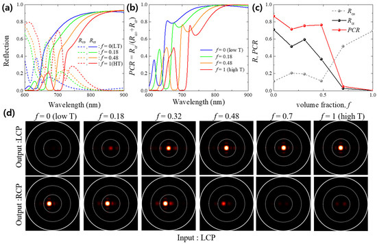 We numerically investigated of the optimized reflectarray metasurface with various degree of metallic phase of VO film. The Drude–Lorentz parameters for dielectric constant of VO with partial metallic phase were estimated by Bruggeman effective medium theory (see Supplementary Materials) [35,48]. As shown in Figure 4a, reflection spectra is red-shift as a volume fraction of metallic phase of VO, f increases because of decreasing n. Consequently, spectra is also red-shift (see Figure 4b). Especially, is maintained over 70% at = 700 nm when f increases until 0.5. However, suddenly decreases with further increasing f, and finally becomes zero at metal phase (f = 1). In consideration of complete phase change within small temperature difference, is very sensitive to temperature near the critical temperature [35]. In order to confirm sensitivity of to temperature, we investigated beam steering as a function of degree of metal phase in VO film. According to Figure 4d, as f increases, the cross-polarized light reflected at radiation angle, ∼11 becomes weak. In contrast, the co-polarized light in normal reflection becomes strong which is well matched with Figure 4c. This result implies that radiation direction could be switched continuously without change of radiation angle by continuous phase change of VO film.