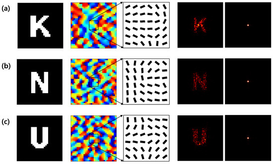 Switchable Fourier hologram generated by VO based reflectarray metasurface with the character (a) K (b) N, and (c) U. The columns from the left to the right indicate the original binary image, phase map, magnified in-plane cut-view of Au nanorod array, and reconstructed far-field images with = 700 nm projected in the polar coordinate at low temperature and high temperature.