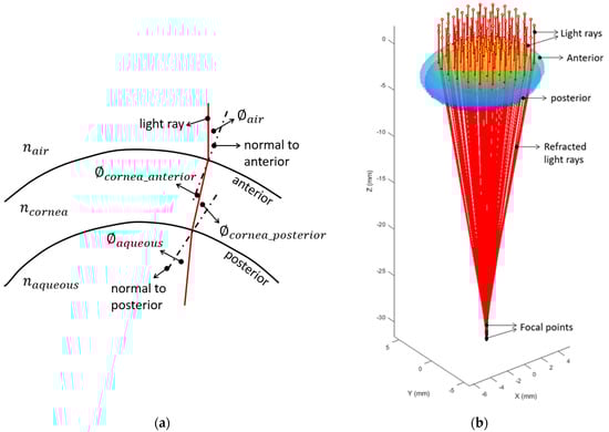 The light ray tracing performance was obtained by simulating parallel light rays directed towards the cornea and refracted through the anterior and posterior surfaces according to Snell’s law [,] (Figure 1). The incidence angle for each ray in the air, , was determined as the angle between the ray and normal vector to the corneal surface at the point of incidence (Figure 1a). The direction of the refracted ray as it passed through the corneal depth, , was calculated by Equation (1), where the refractive indices of air, , cornea, , and aqueous, were set to 1.0, 1.376, and 1.336, respectively, following Gullstrand’s relaxed eye model [,].