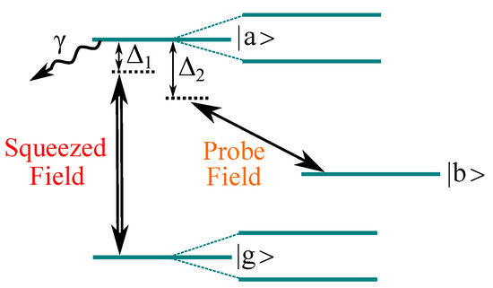 - Ferguson, M.R.; Ficek, Z.; Dalton, B.J. Resonance fluorescence spectra of three-level atoms in a squeezed vacuum. Phys. Rev. A 1996, 54, 2379. [Google Scholar] [CrossRef] [PubMed]