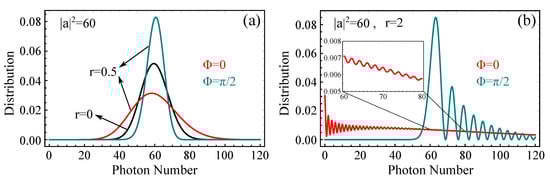 In Figure 2a, we plot the photon number distribution of an SQCS with a squeezing parameter and compare it to the distribution of a coherent field (). As becomes evident, depending on the phase difference , the distribution deviates from its Poissonian form, by exhibiting super-Poissonian (red line) or sub-Poissonian statistics (teal line). The situation becomes even more interesting for larger values of r. In Figure 2b, we plot the photon number distribution of an SQCS with a squeezing parameter for two values of and observe an obvious non-classical behavior with vivid oscillations in both cases. These oscillation were interpreted in the past by Schleich and Wheeler [65,66] as resulting from the interference of error contours in phase space. In the case (red line), the distribution is peaked at , and the oscillations are much faster compared to the case (teal line), where the distribution is peaked at a slightly higher photon number than the peak of the Poissonian distribution and the oscillations appear only for photon numbers larger than the position of the peak. It should be noted that the photon number distributions of Figure 2 acquire discrete values for each value of the integer n, but are depicted as continuous since the photon number scale over which they are plotted is large. To avoid any misconception, there is another form of Equation (10) often found in the bibliography where the distribution is essentially the same, but it exhibits sub-Poissonian statistics for and super-Poissonian statistics for . This is a reflection of whether the SQCS is defined as or , which are not equal since the operators and do not commute. In any case, one can go from one definition to the other through the relation: